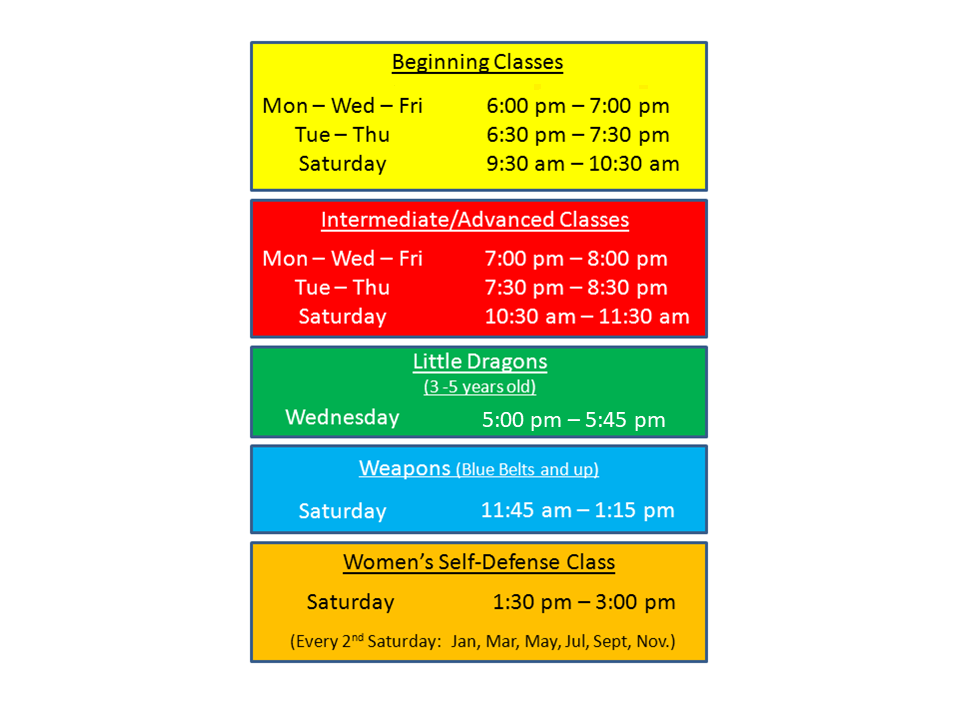 WE OFFER FAMILY DISCOUNTS: 2nd person $10 off per month;3rd person $20 off per month; 4th person $30 off per month.(Except for Little Dragon's & Once a Week Classes)